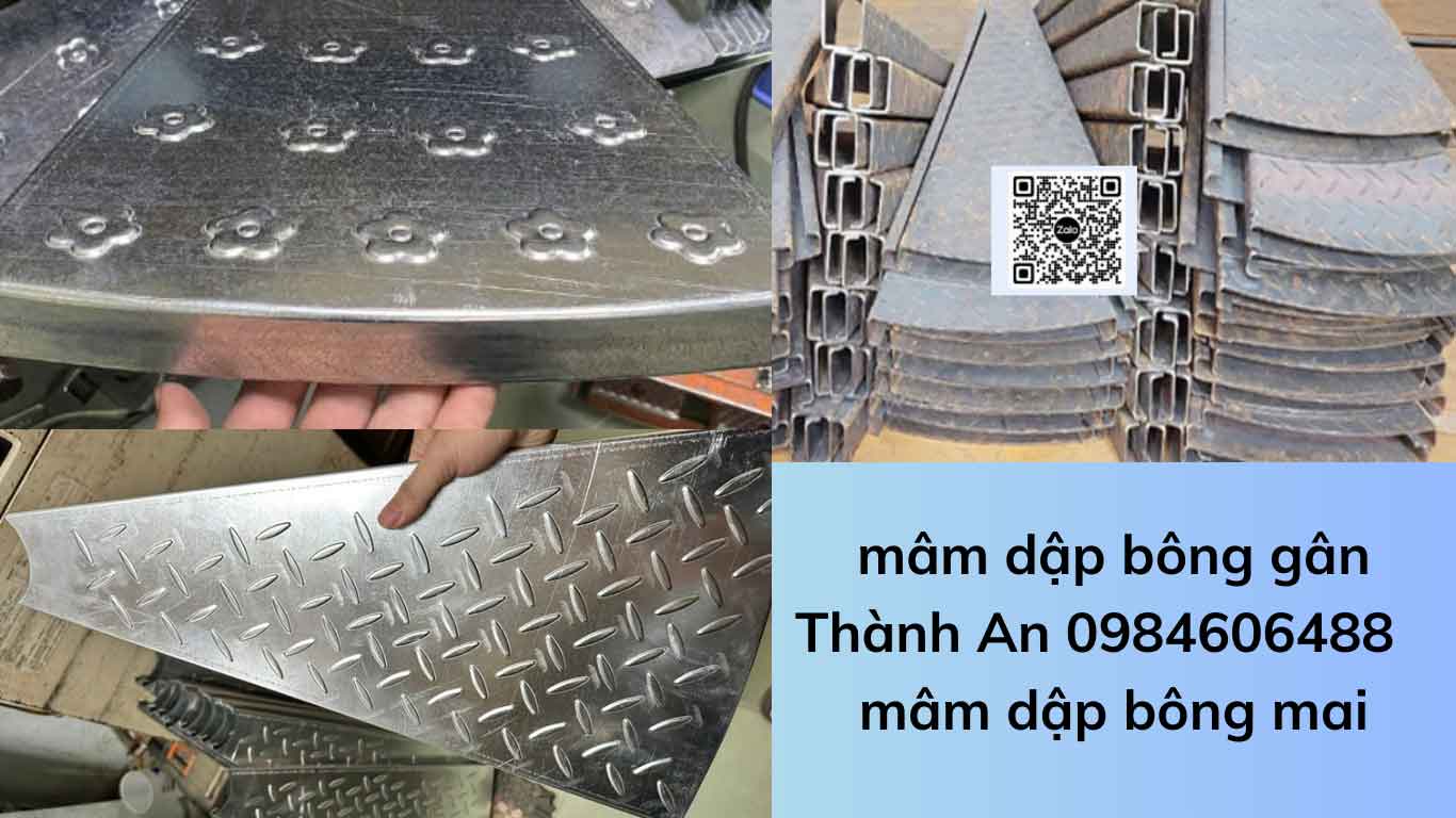 Mâm bậc thang sắt dập hình bông mai , hình bông lúa hay còn gọi bông gân : Độ dày 1mm tới Độ dày 2.5mm được mạ kẽm chống rỉ sét, Độ dày 3mm dùng thép tấm đen, Mâm bậc thang sắt dập hình bông mai hoặc bông cúc